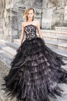Toto nádherné zúfalý tyl a organza čierne svadobné šaty má gotické vplyvy, ale môže fungovať pre každú nevestu, ktorá hľadá jedinečné čierne svadobné šaty. Vyznačuje sa krásnym priliehavým živôtikom s hlbokým výstrihom z eleganltu a veľmi plnou sukňou s krásnymi vrstvami tylu. Štandardné veľkosti sú od nuly do 26, ale za príplatok si ich môžete nechať vyrobiť aj na mieru. Ceny začínajú zhruba na 3 100 dolároch.