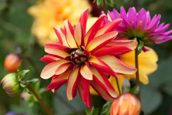 Dahlias originate from Mexico and Guatemala where they produce single flowers. Enthusiasts in Europe in the 18th century bred many different forms, which now produce blooms that range from 5cm to 30cm in diameter.