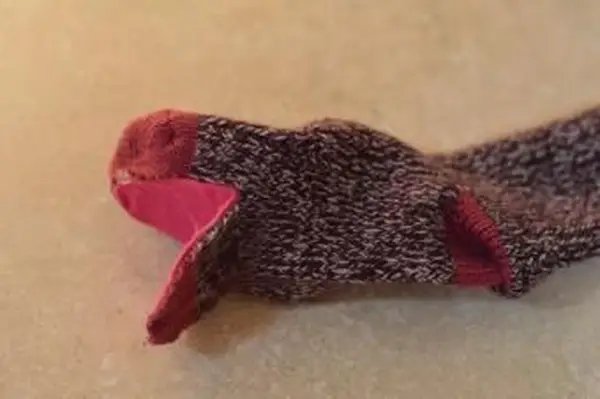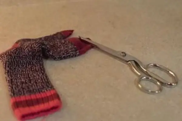 - Položte ponožku na pracovnú plochu. Tesne pod špičkou ponožky urobte rez. Môžete to urobiť tak hlboko, ako sa vám páči. Toto budú ústa koňa.