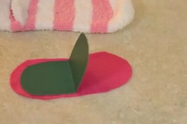 - Začnite vytvorením úst pre svoju bábku. Vystrihnite ovál z plsti alebo rúna, ktorý má približne rovnakú veľkosť ako podrážka ponožky. Vystrihnite o niečo menší ovál z kartónu. Kartotéku preložte na polovicu, aby ste ju pokrčili, a potom ju rozložte.