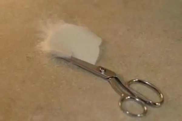 - Vystrihnite obdĺžnik z rúna, ktorého šírka je asi päť centimetrov a približne dve tretiny dĺžky vašej ponožky. Obdĺžnik preložte pozdĺžne na polovicu a urobte rovné rezy od otvorených okrajov smerom do stredu, pričom dávajte pozor, aby ste ich nezrezali úplne, aby ste vytvorili strapce. To bude hriva. Držte obdĺžnik zložený a prilepte ho k bábke.