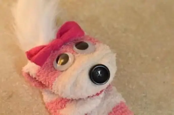 - Ponožku preklopte tak, aby strana úst smerovala dole. Naneste lepidlo na nosovú časť a prilepte ju na špičku ponožky. Na dve googlyké oči nanesieme lepidlo a na ponožku ich prilepíme o niečo vyššie. Nakoniec naneste linku lepidla na rovnú stranu každého z uší a tie prilepte na ponožku tesne za oči.